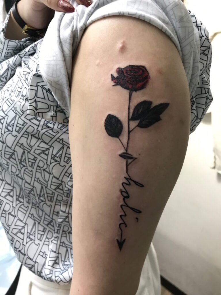 上腕にカラーの薔薇とレタリングのデザインです。