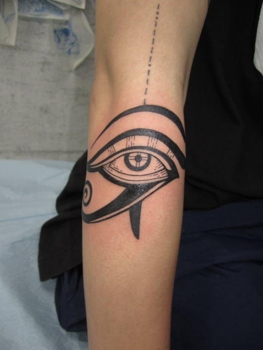 古代エジプトの天空と太陽の神ホルスの右目です。 ホルスの右目は太陽神ラーの目、左目は守護女神ウアジェトの目とされています。 どちらもタトゥーのモチーフとして人気があります。